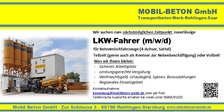 Werde ein Teil von MOBIL-BETON und lerne, wie man mit Beton umgeht! Bei uns bekommst du die Chance, deine Fähigkeiten im Bereich Transportbeton unter Beweis zu stellen. Lerne von den Besten und werde ein Experte in diesem Bereich. Bei MOBIL-BETON arbeitest du in einem gut geführtem Unternehmen und erhältst die beste Ausbildung im Bereich Transportbeton. Du bist sicher, dass du bei uns die richtige Wahl triffst.